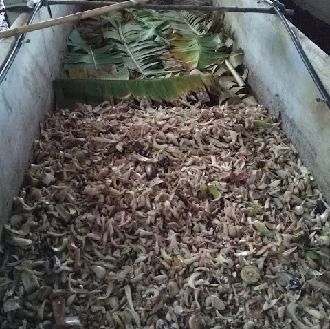 - ให้ใช้ใบกล้วยแห้ง หรือ ใบกล้วยสด ๆ ก็ได้ครับ สับ ๆ แล้วโรยทับ ทำให้เหมือนไส้เดือนอยู่ในกอกล้วยนะครับ