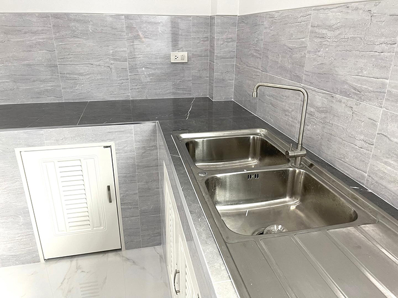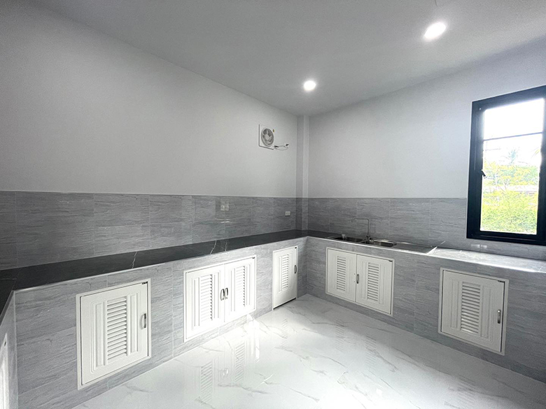 ห้องครัว พื้นห้องปูทับด้วยกระเบื้องอย่างดี รวมถึงเคาน์เตอร์ครัวและผนังบริเวณนั้น บนเคาน์เตอร์ได้ติดตั้งอ่างล้างจานแบบ 2 ช่อง ส่วนในขณะที่ประกอบอาหาร ก็มีทั้งหน้าต่างและประตูหลังบ้านที่เป็นช่องทางระบายอากาศ