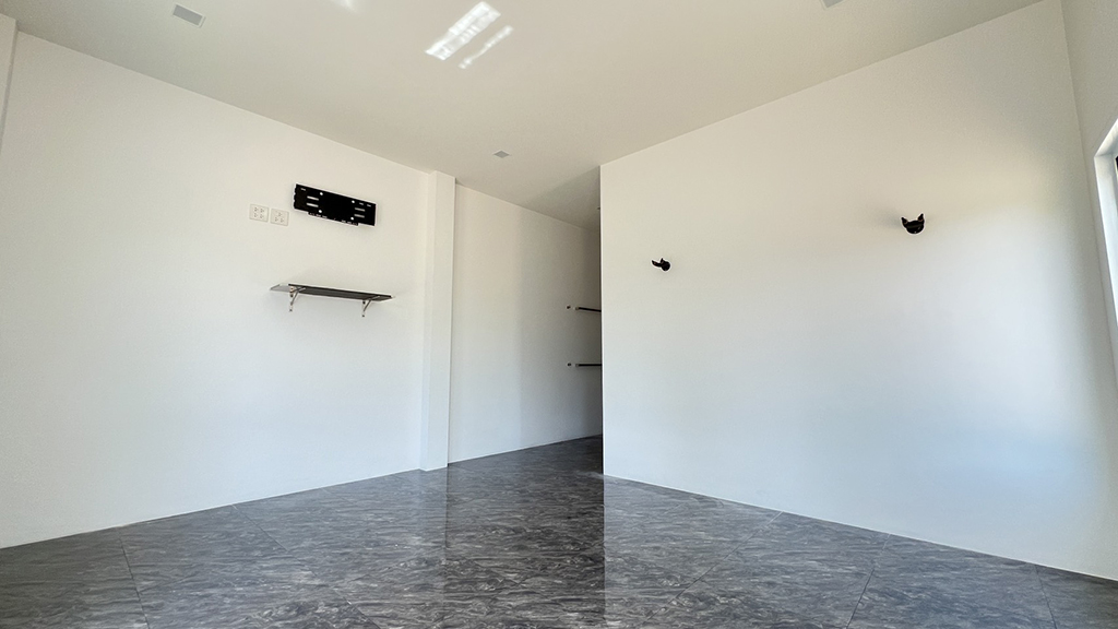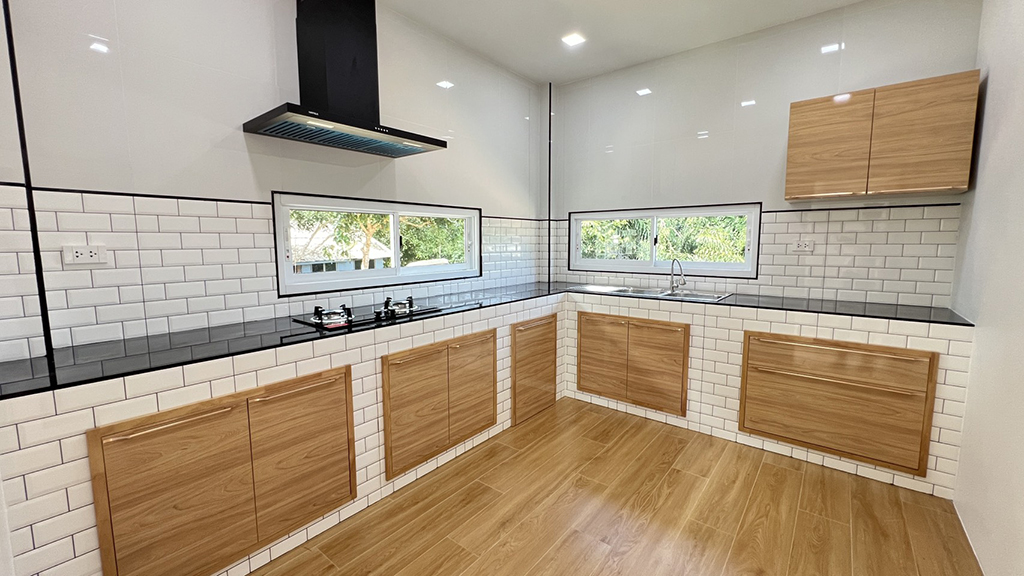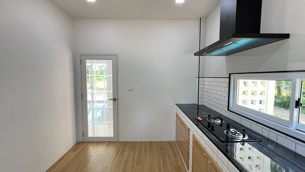 บริเวณเตาแก๊สมีเครื่องดูดควันติดตั้งไว้เรียบร้อย พร้อมหน้าต่างแนวยาวสองด้านที่ช่วยระบายอากาศและรับแสงธรรมชาติ ทำให้ครัวสว่าง โปร่ง ไม่อับชื้น เวลาทำอาหารก็ไม่ต้องกังวลเรื่องกลิ่นสะสม ส่วนประตูด้านข้างสามารถเปิดออกไปยังพื้นที่ซักล้างหรือหลังบ้านได้สะดวก